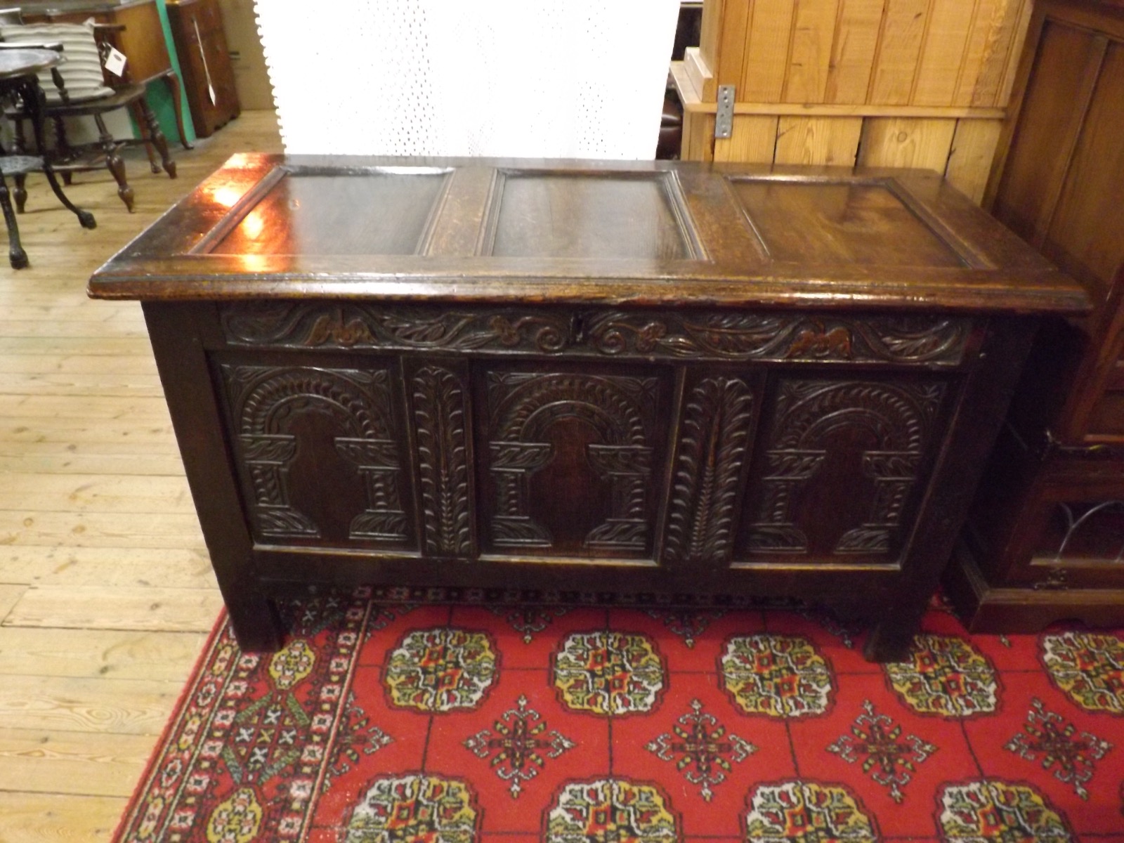 Good quality 18th Century Oak coffer with carved triple fluted panels and original candle box. This is a wonderful piece with the original hinges in place of the top. Lovely rich dark oak with detailed front. This is a brilliant piece to add to any home with a history, functional and well worth a closer look.