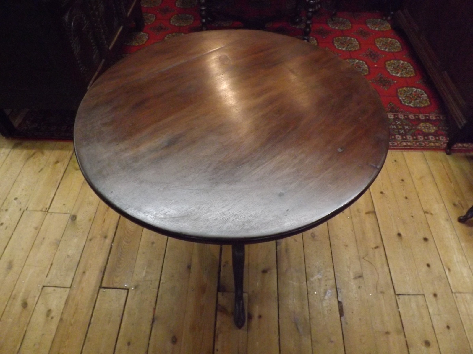 A Simple but elegant 18th Century bird cage top pedestal table that tips and revolves. There is a slight mark on the top which is highlighted in the photos but a beautiful table made of a rich dark Mahogany.