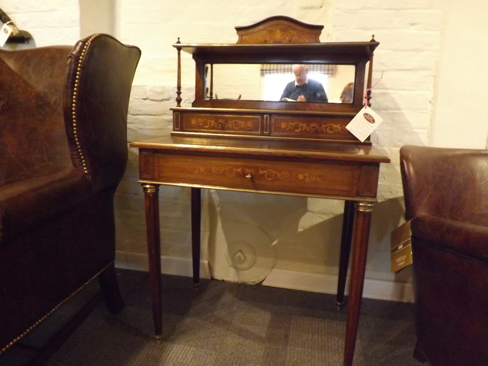 An elegant and unique example of an inlayed rosewood ladies writing table. All original this table comes complete with fine brass mounts, leather inset top, mirror and draws. Dated late Victorian and in excellent condition.