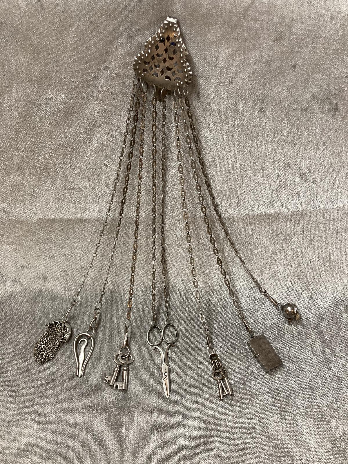 A superb antique cut steel chatelaine with eight elaborate cut steel chains. The chatelaine contains a velvet lined box /needle case, keys, miniature chain mesh purse, folding button hook, a ball tape measure and a pair of scissors - with J MOORE engraved which could be the owner or the maker. Truly this is a wonderful find and in beautiful condition.