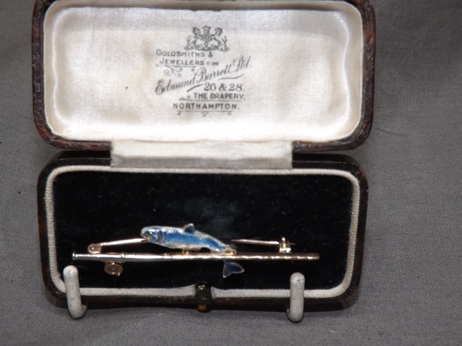 This is a very unusual bar brooch made of a mix of silver enamel and 9ct gold. The fish is silver and enamel while the rod and reel are 9ct gold. The trout is finely detailed.