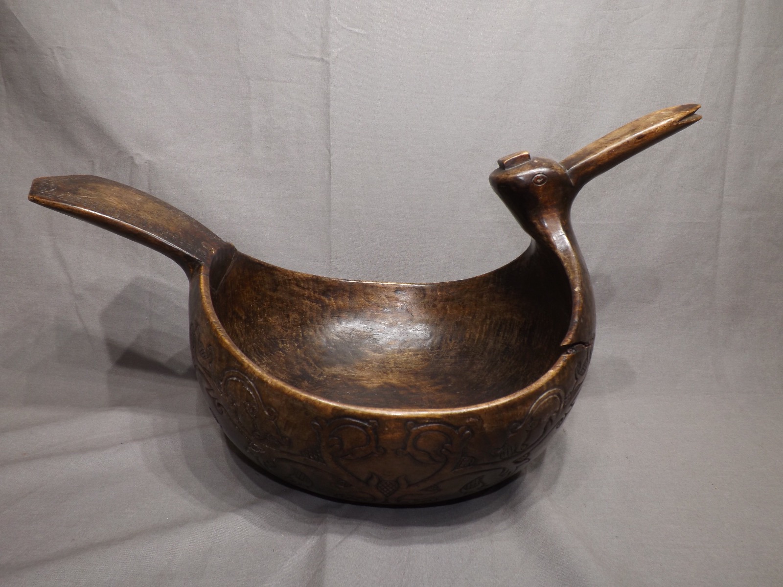 Here we have a very unusual late 19th Century Black Forest carved bowl shaped to resemble a bird. This item is carved of a single piece and still has a partial label to the base of the item. There are some marks and splits forming in the wood due to age.
