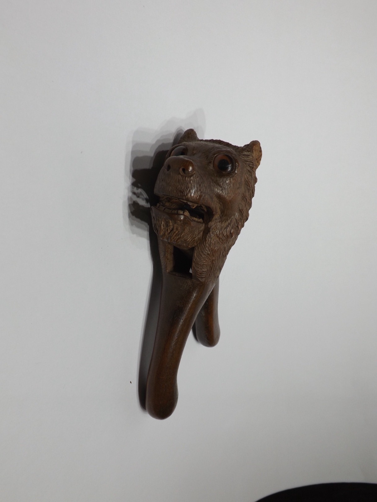 Here we see a wonderful Black Forest carved nutcracker shaped like a bears head with glass eyes. The bear's head is very detailed and well carved with a smooth finish providing an easy grip on the handles.
