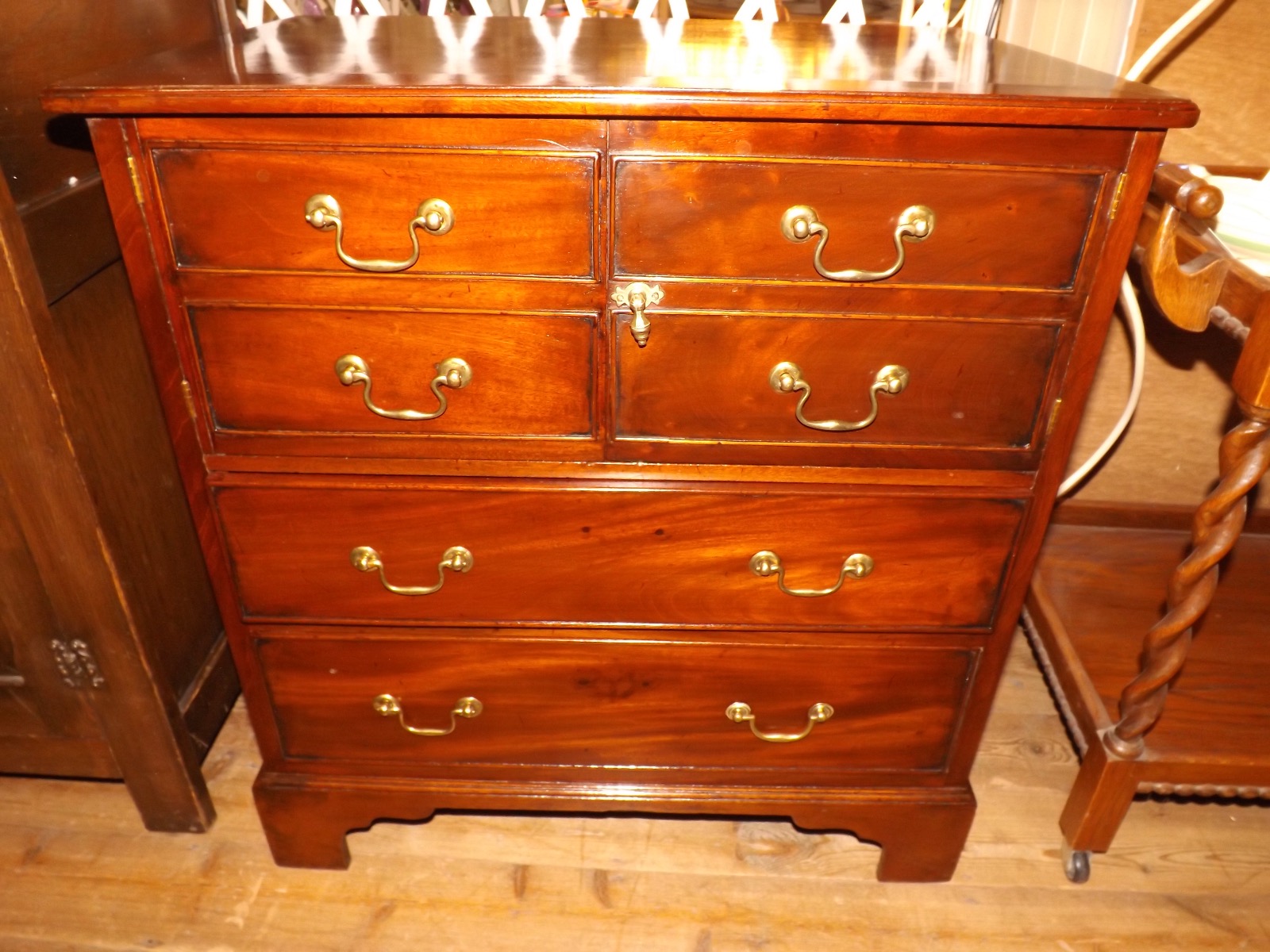 Beautifully presented small mahogany chest of drawers with false front cupboard top. This is a lovely piece and very versatile with the cupboard top over two drawers.