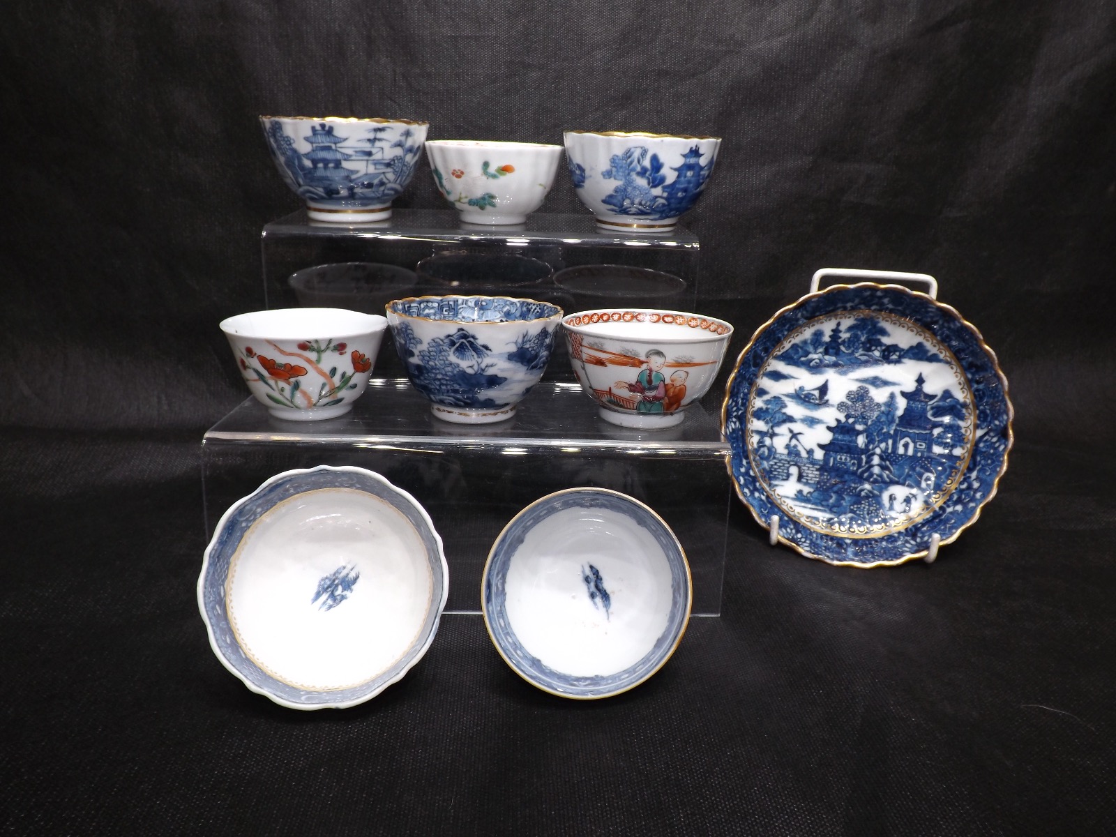 Collection of 18th Century Tea bowls plus one salopian dish. There are three Chinese polychrome examples and four blue and white English pieces.