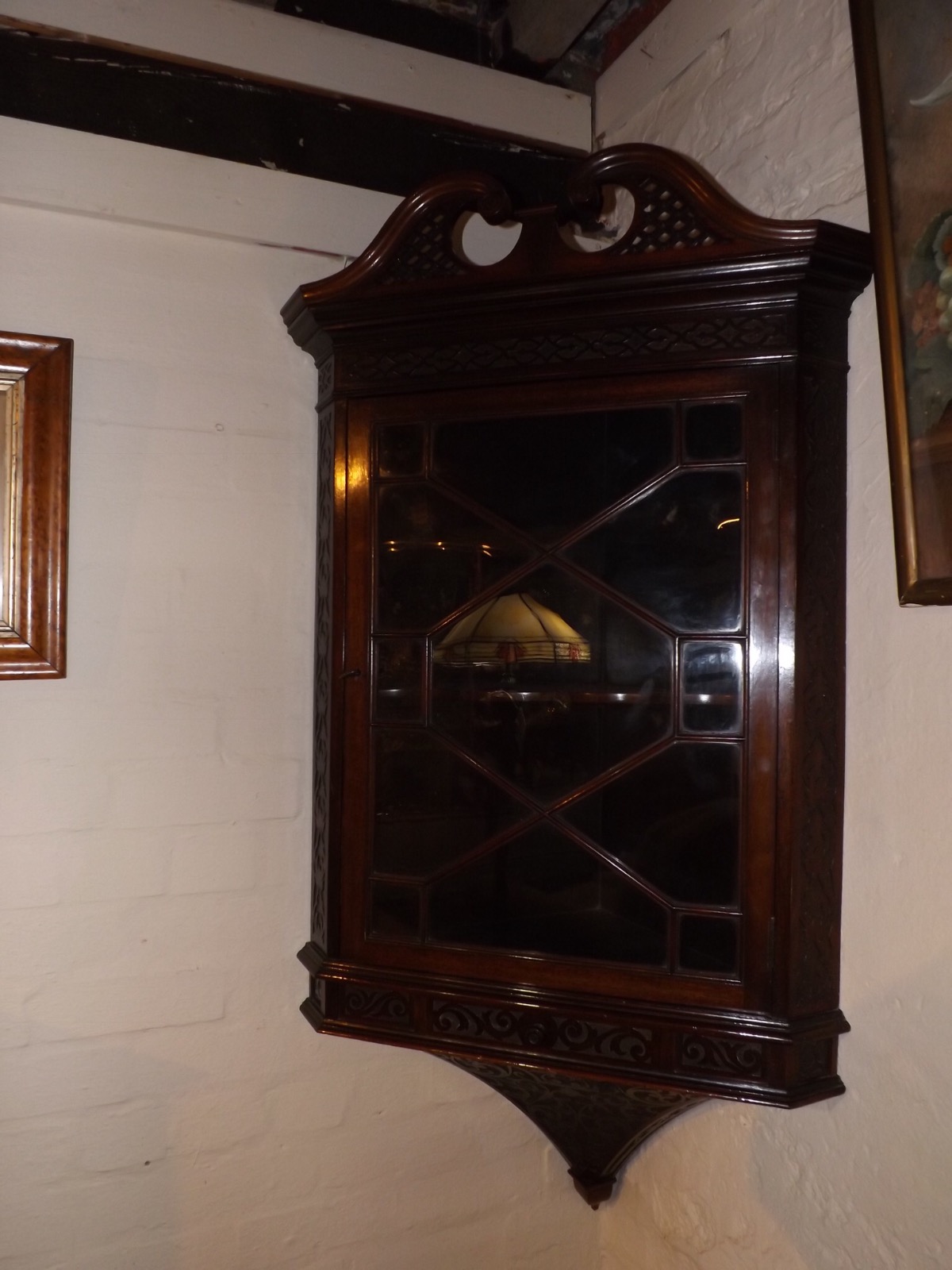 This is a fine quality late Victorian antique mahogany blind fret hanging corner cupboard with drawer.