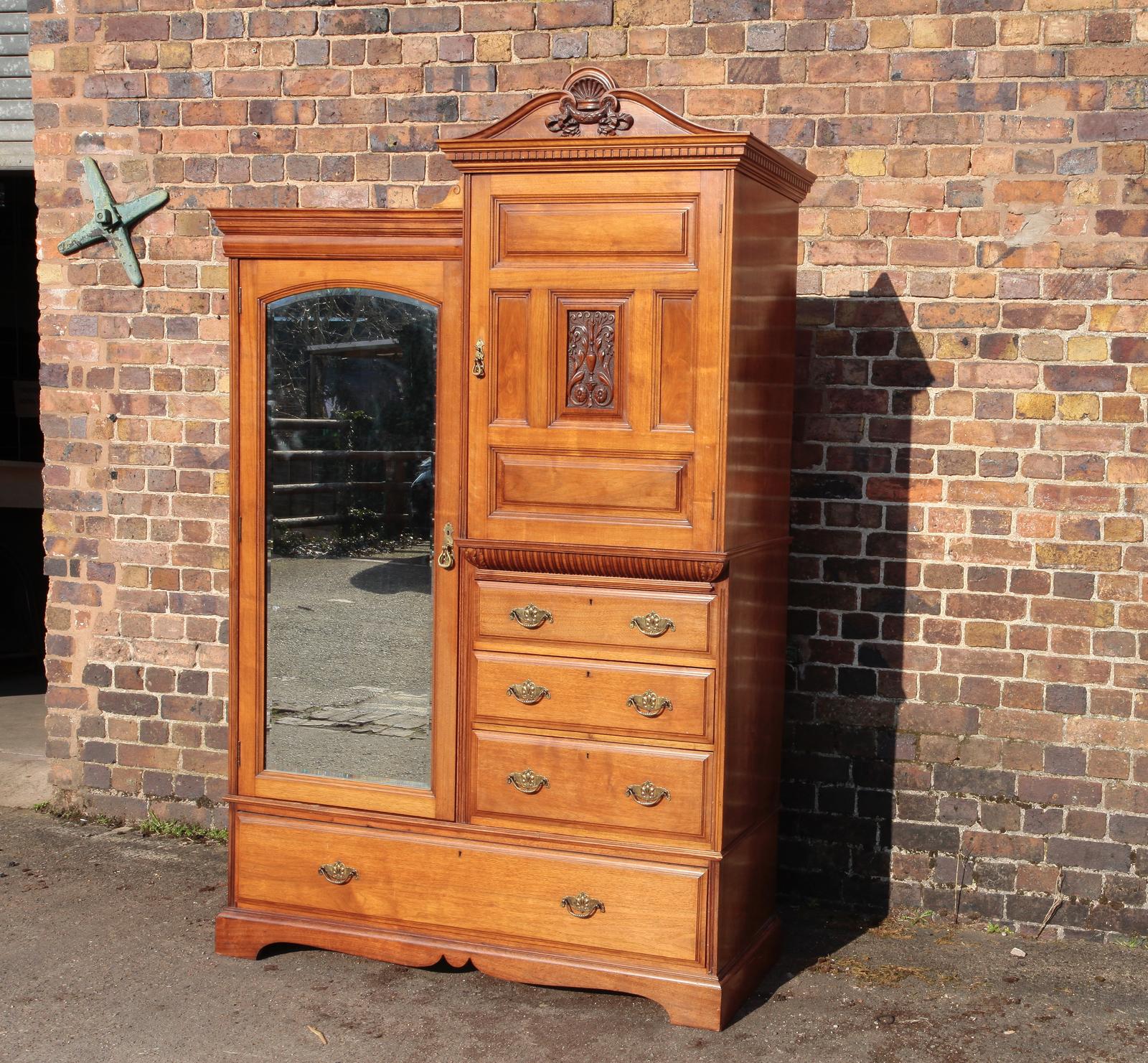 Edwardian compactum breakfront wardrobe in oak with walnut panels. It incorporates three small drawers and one large drawer with brass handles and mirrored wardrobe door. In very good condition, an attractive piece of furniture.