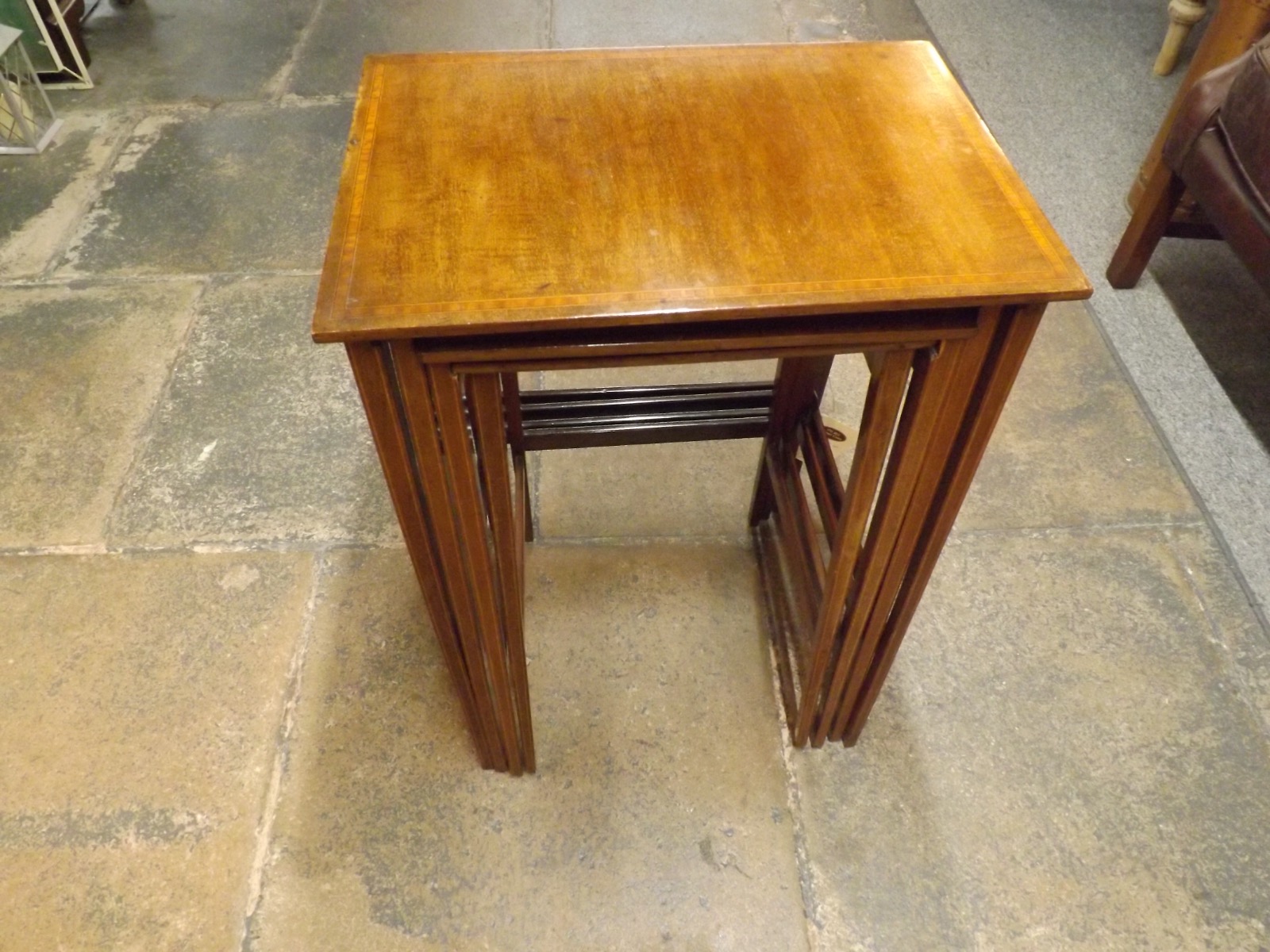 Edwardian mahogany crossbanded with satinwood inlaid set of four nest of tables. The largest table is a little faded in colour but the smaller three are a beautiful rich medium mahogany