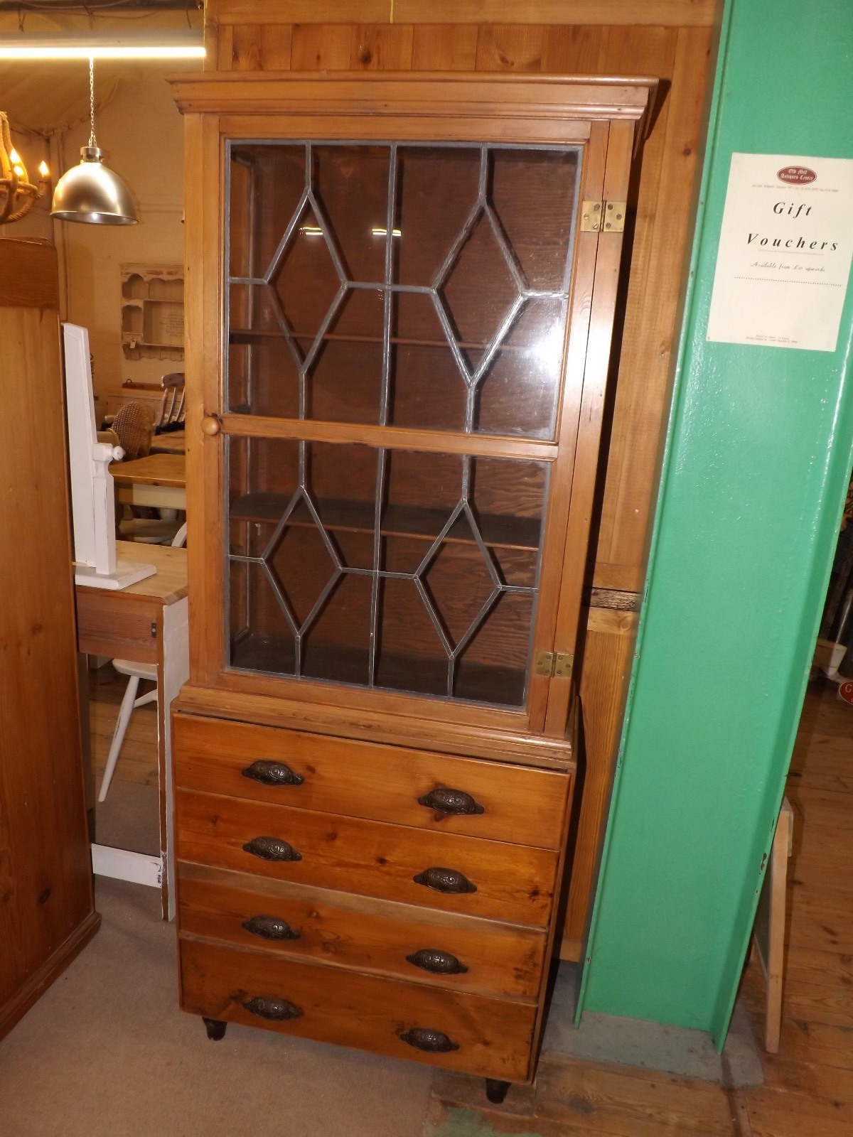 In a rough and ready condition full of charm and character. There are three strips missing from the lead lining on the cabinet door
