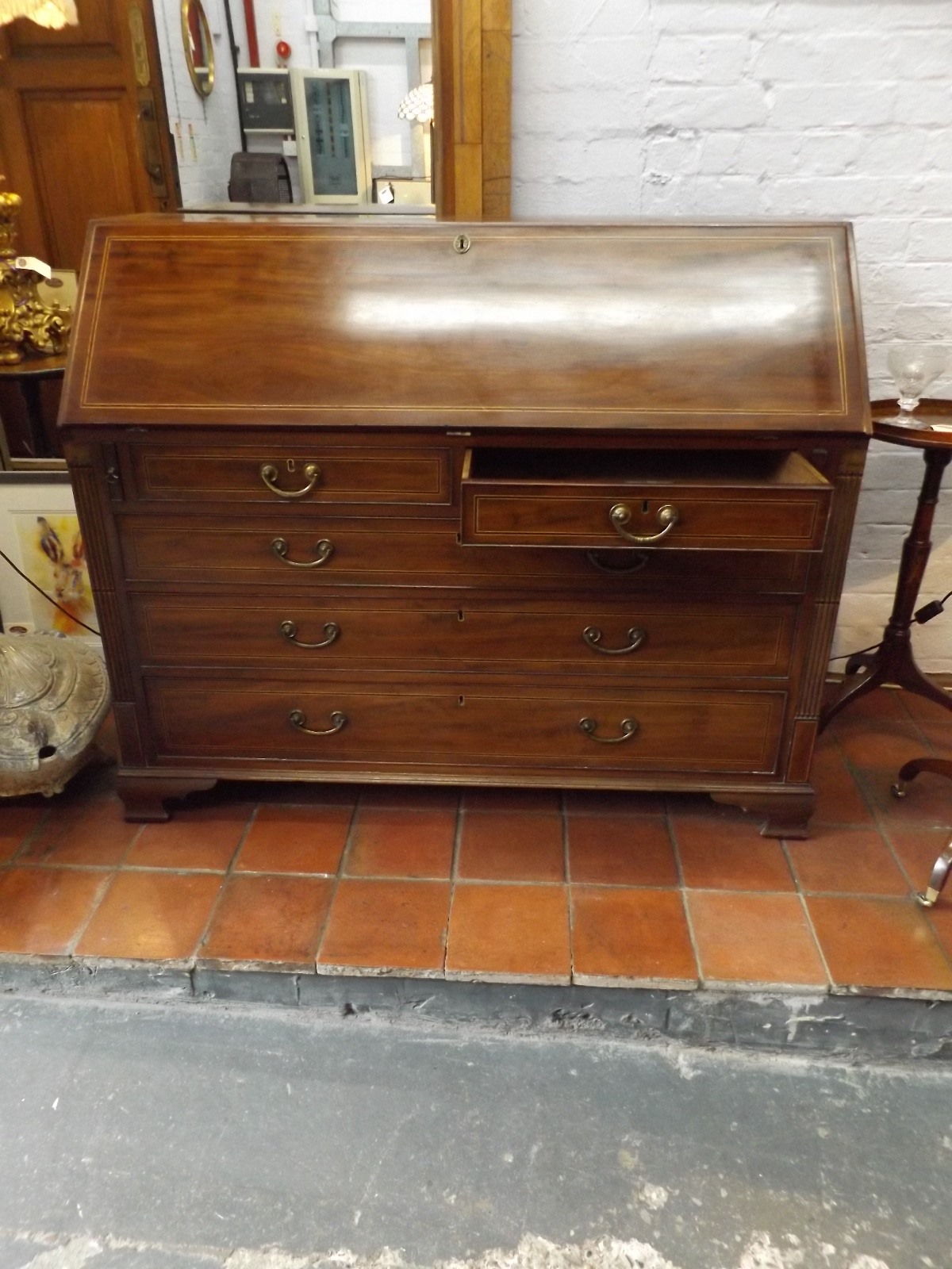 Here we have a beautiful mahogany bureau inlaid with satinwood and ebony creating a multi toned vibrant piece with seashells made of satinwood for decoration.