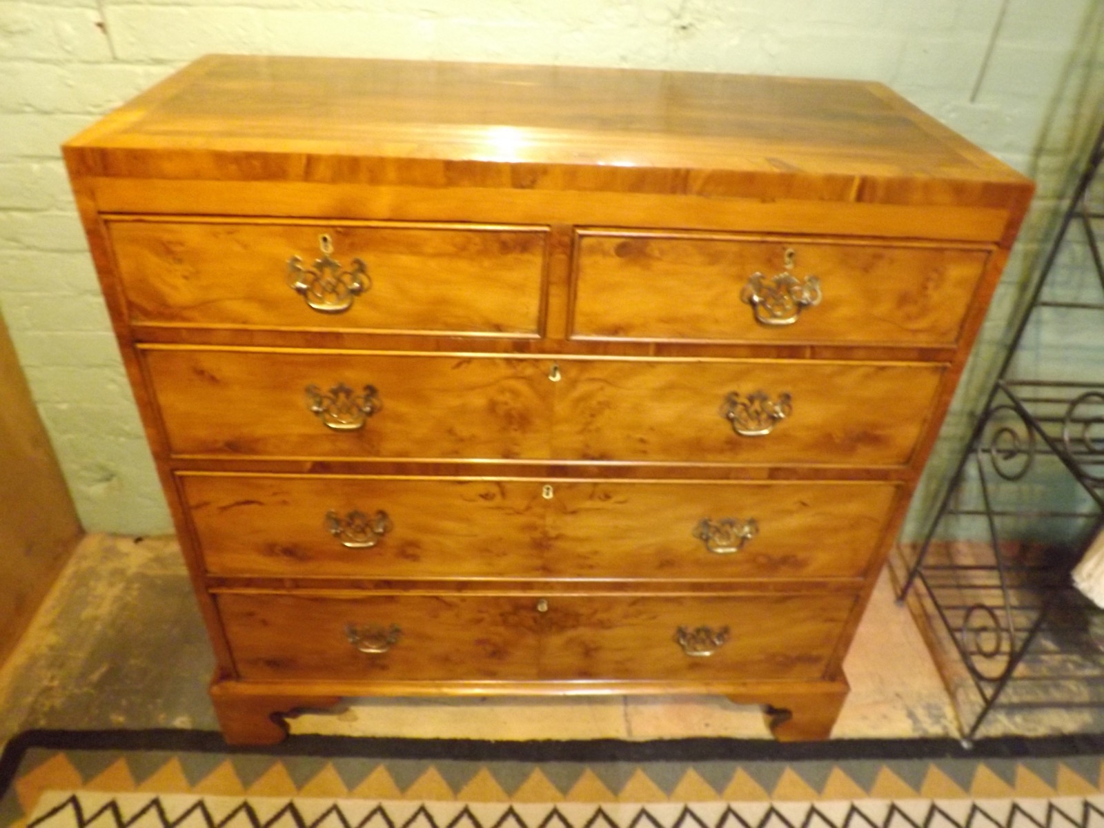 This is a rare late Georgian antique yew wood veneered chest of drawers in beautiful condition with brass handles.