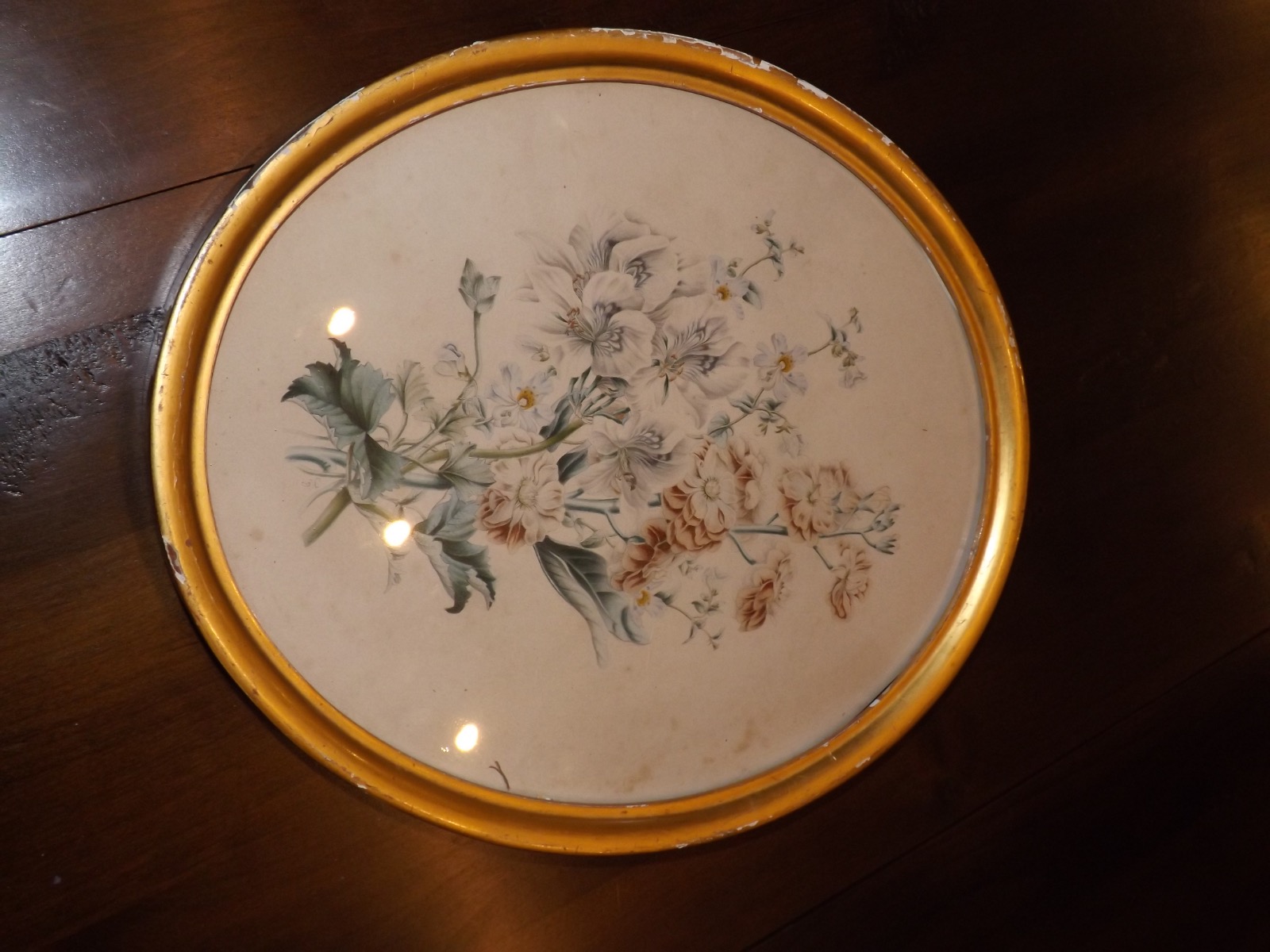 Here we have a very sweet Georgian floral hand coloured print with lots of detail. Though simple in style this is a classic example of a good Georgian coloured print. Made circa 1800-1840 with newspaper on the back board. There is some signs of aging but they only add more intrigue for a collector.