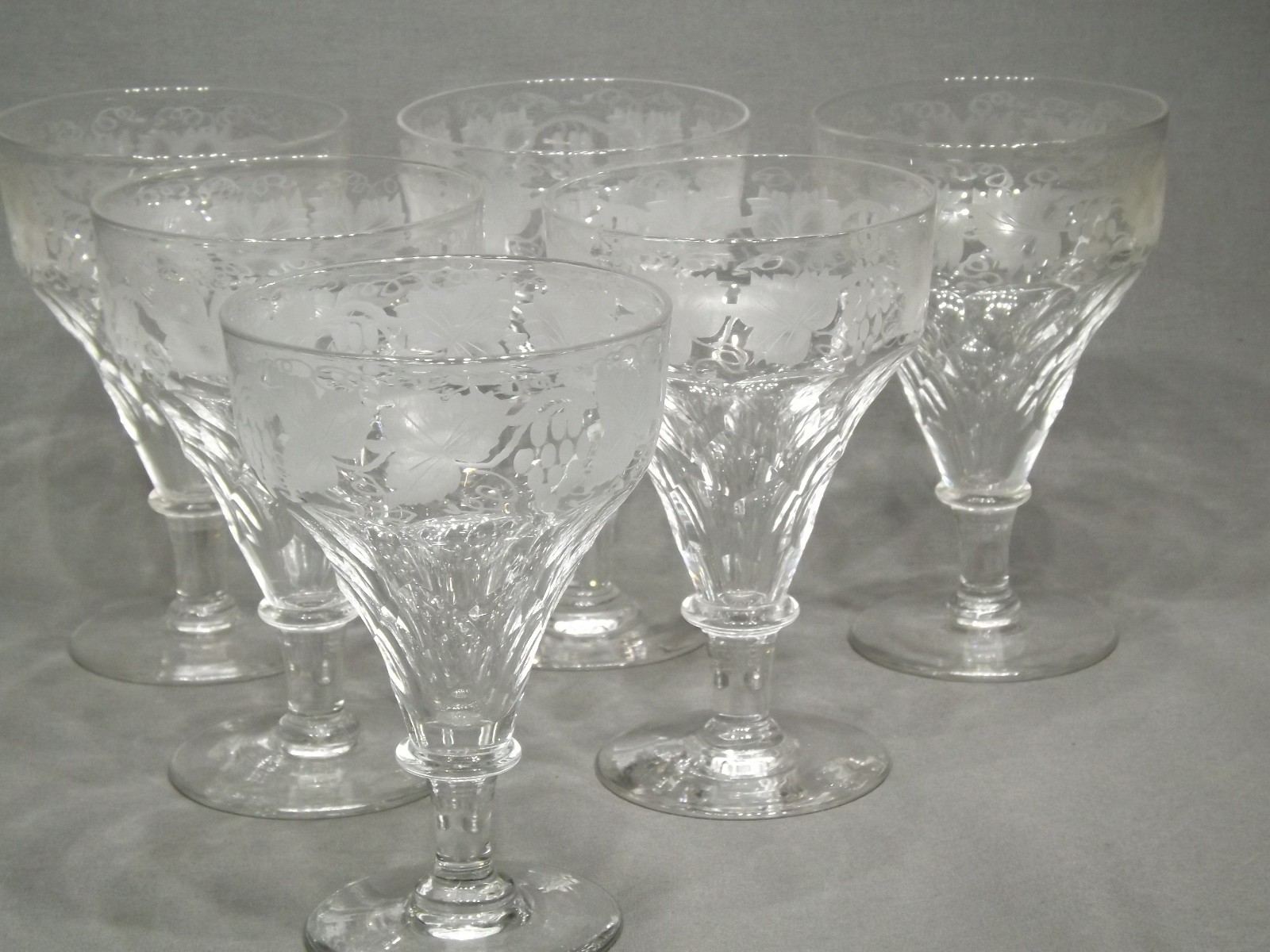 Set of six 19th Century Georgian antique rummer's with fastened bowls and engraved bowls of fruiting vines.