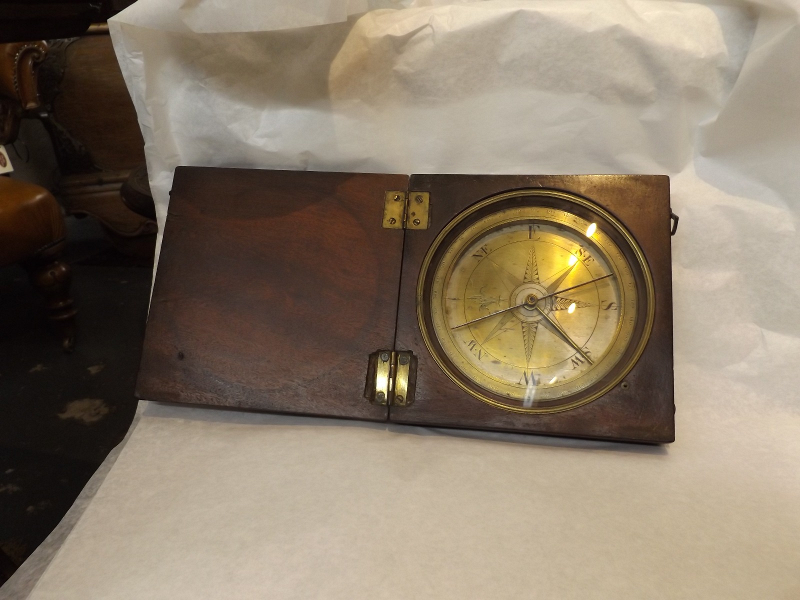 Offered for sale is this fantastic Georgian antique mahogany cased table compass with a 5" silvered dial by J. Trow Birmingham.