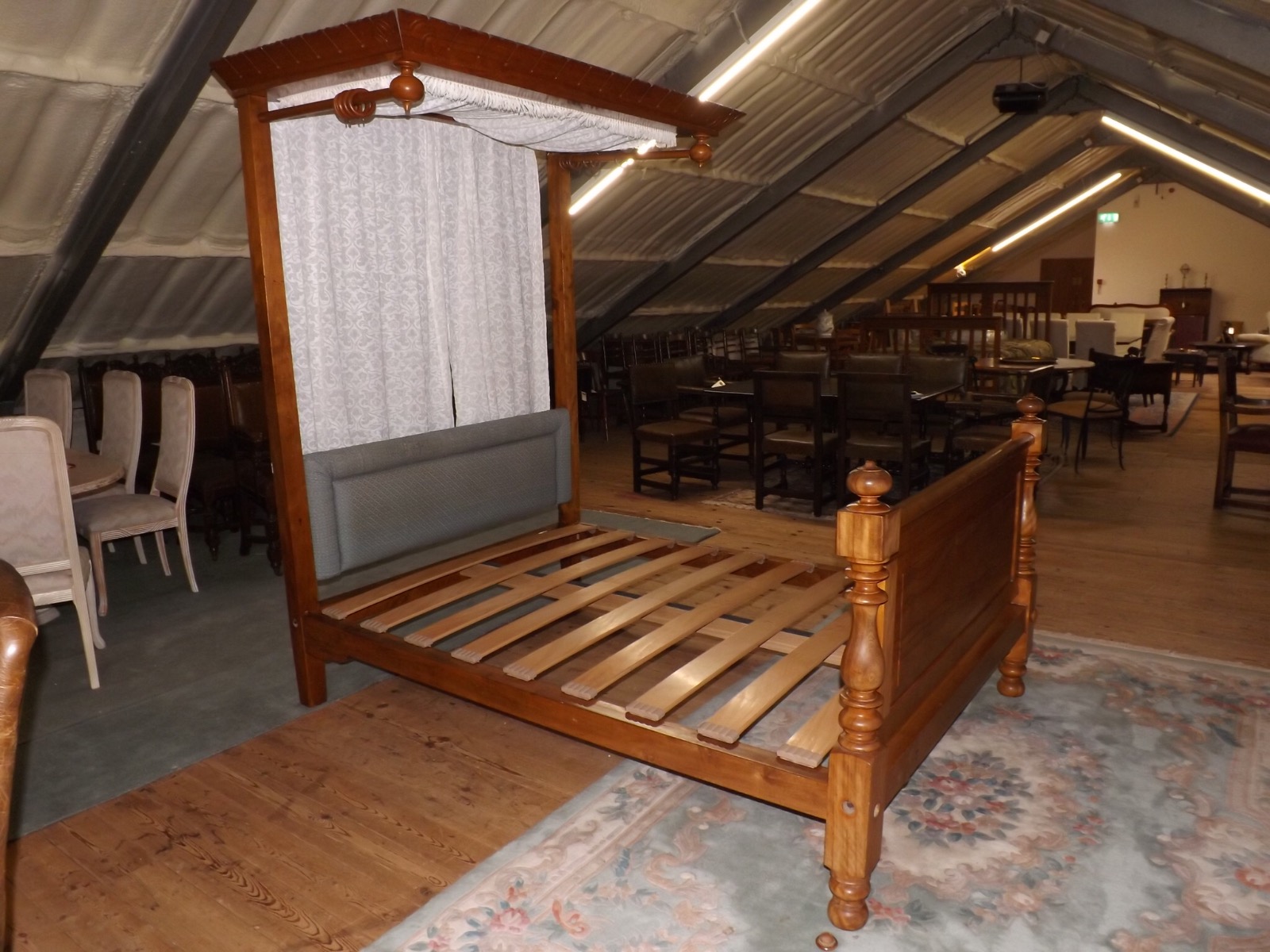 This is a fine quality Victorian antique satinwood and walnut half tester double bed.