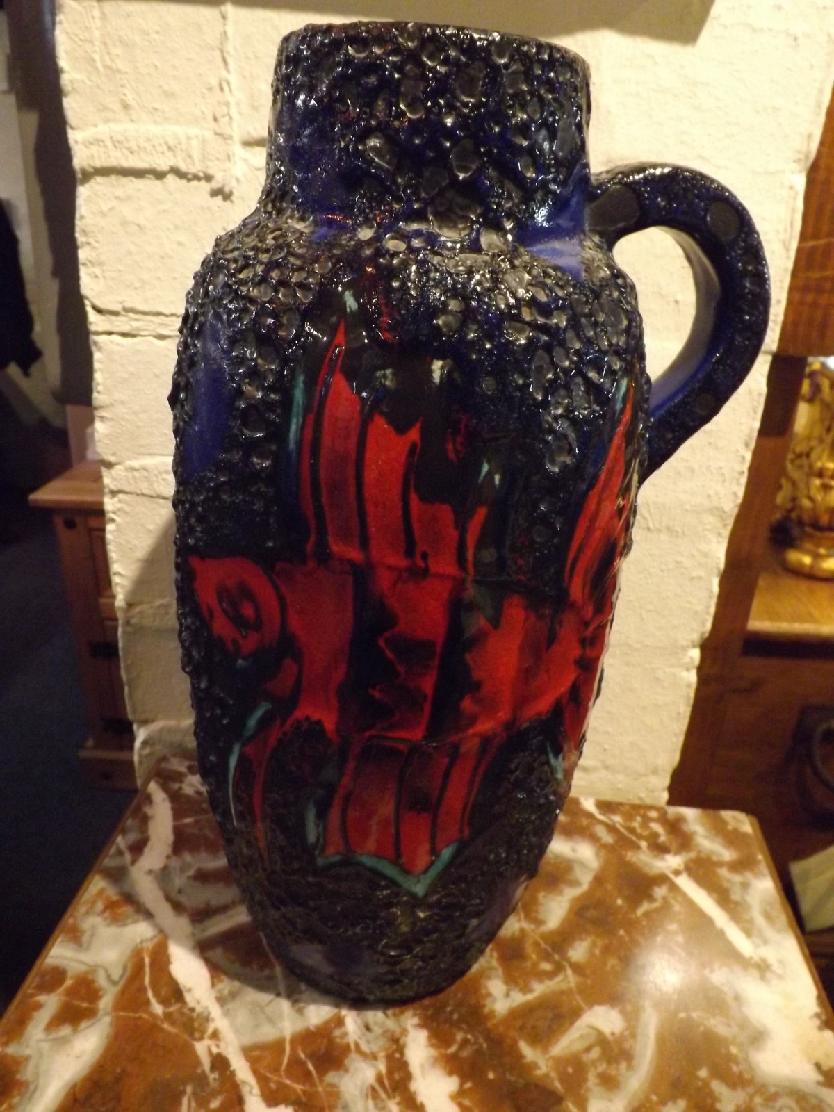Bold and beautiful west German lava jug made in the 1950s. The jug is a very tactile piece in great condition and would make a wonderful addition to any home. The base diameter of the just is 11cm but with the handle I'd make the width closer to 20cm the height is 37cm.