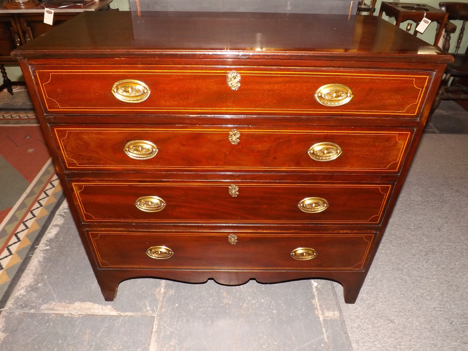 Fine early 19th Century antique inlaid mahogany chest of drawers beautifully made with detailed drawer handles of brass with acorn design.