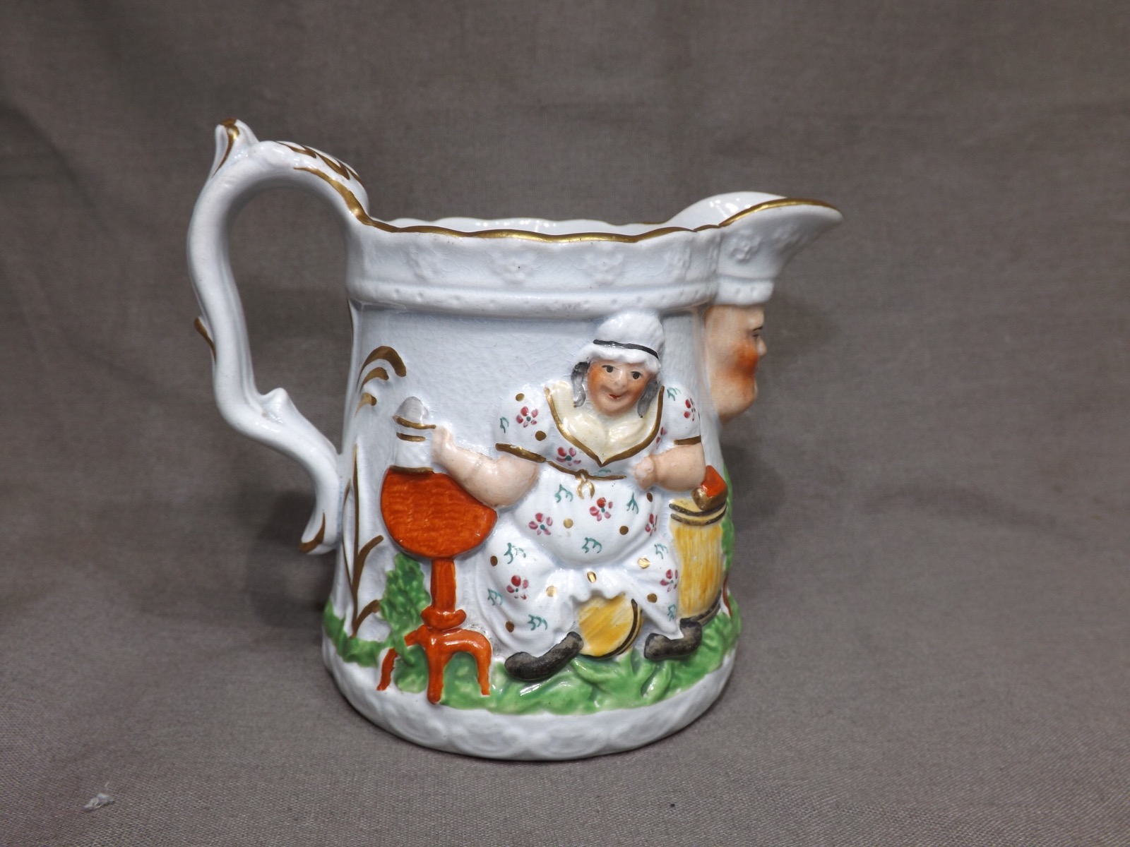 Offered for sale is this brightly coloured 19th Century antique Staffordshire lustre Mask Jug with gilt detailing.