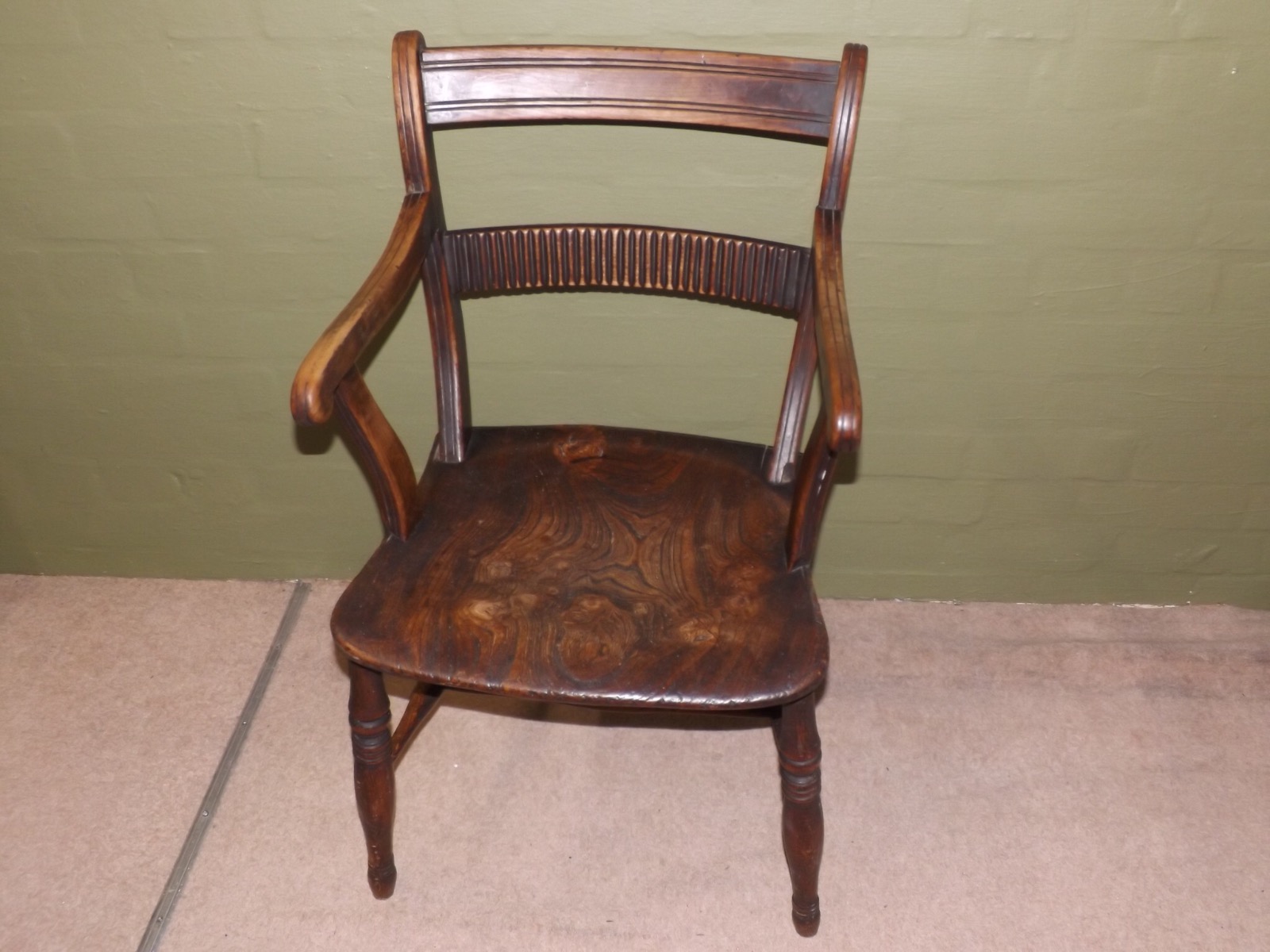 This is a beautiful multi tonal early 19th Century antique mendlesham chair made of elm and fruitwood.