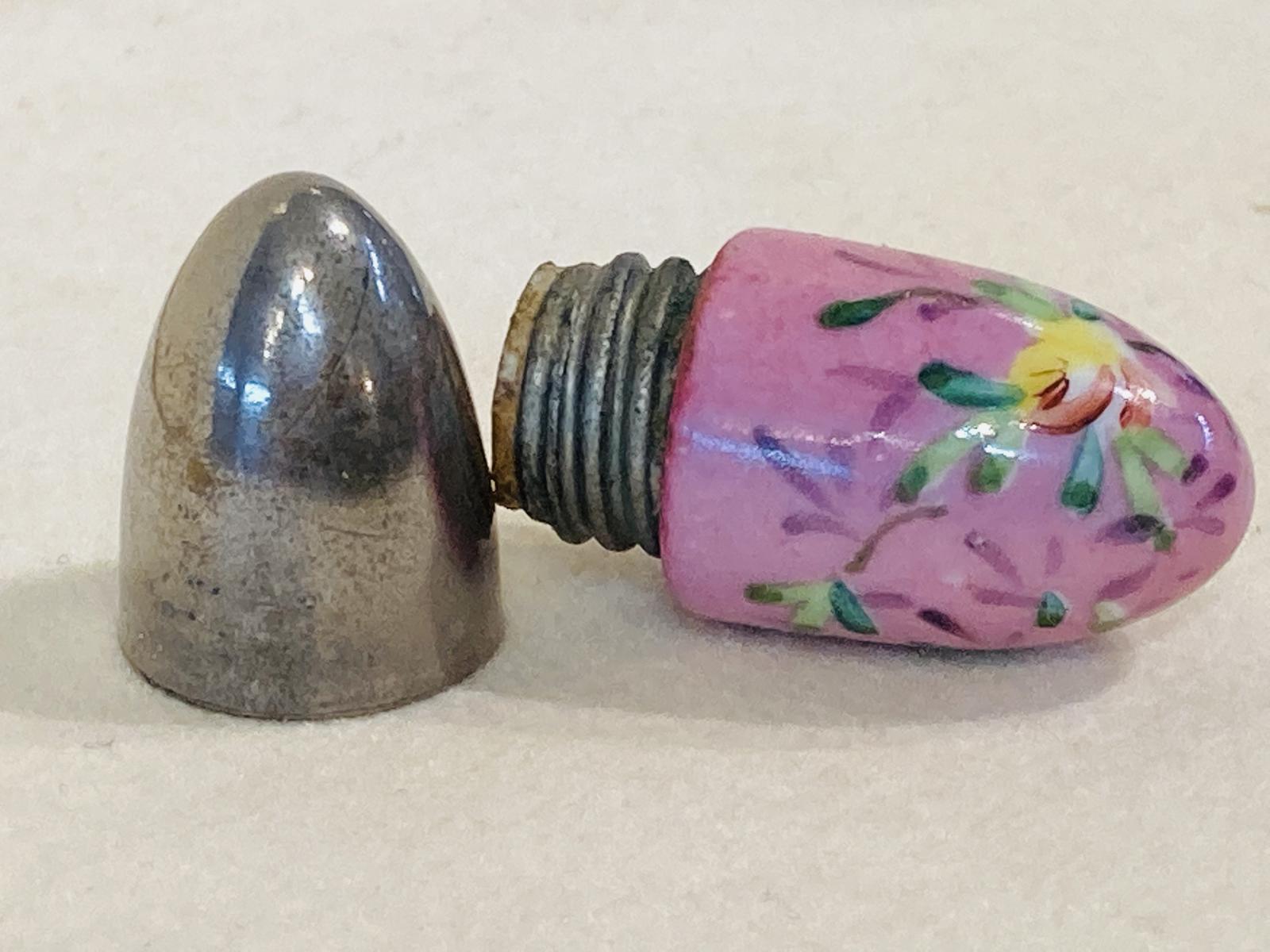A beautiful miniature scent bottle made of good quality opaque glass with hand painted floral decoration and original screw top.