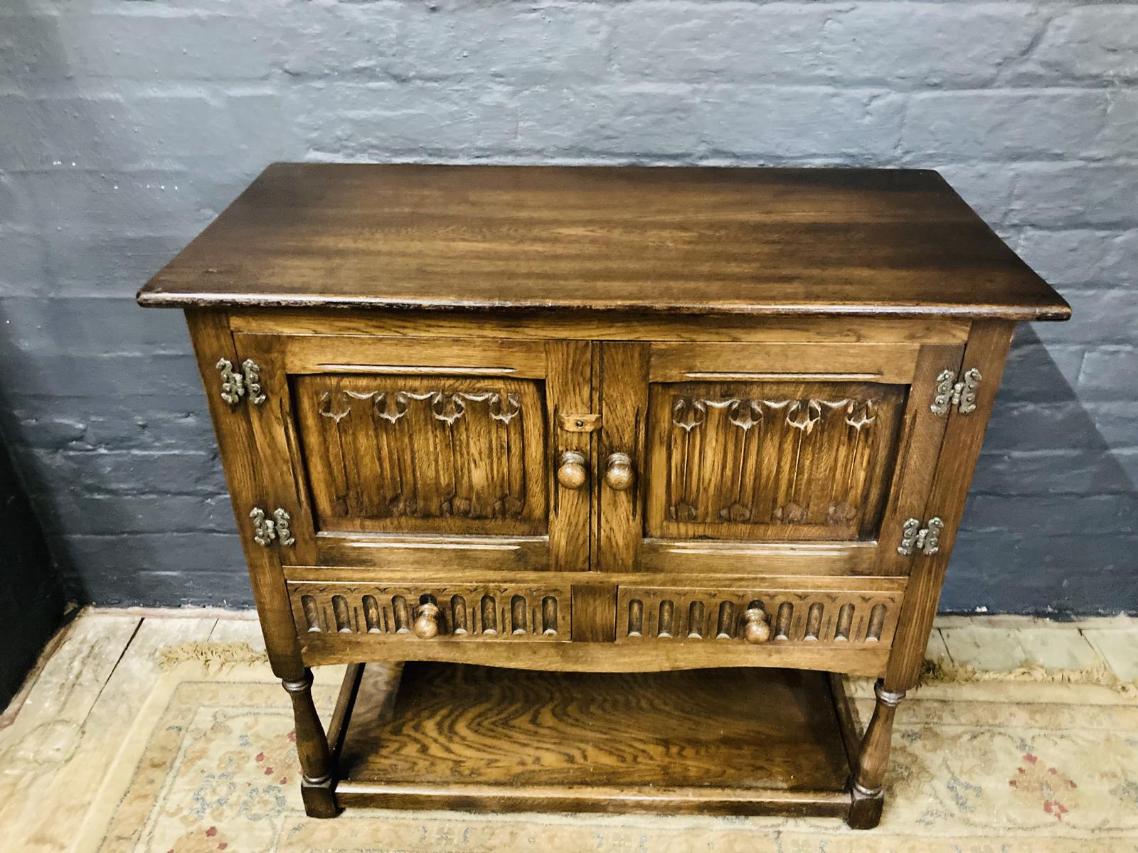 A lovely two door side cabinet with linen fold doors in the style of the old charm furniture. The cupboard has two doors over two drawers with an shelf underneath,