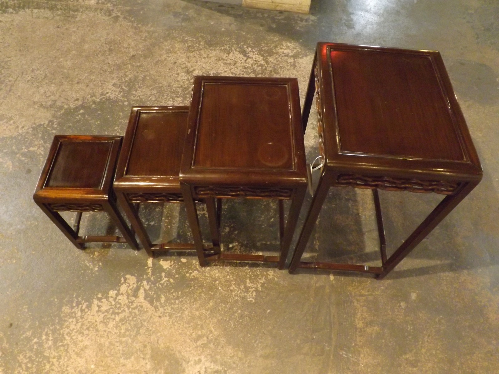 Set of four rosewood Chinese carved nest of tables. The largest table measures at 89.5cm high 45.5cm wide and 35cm deep the smallest is 26.5cm wide 24cm deep and 39.5cm high. The tables sit nicely together for easy storage.