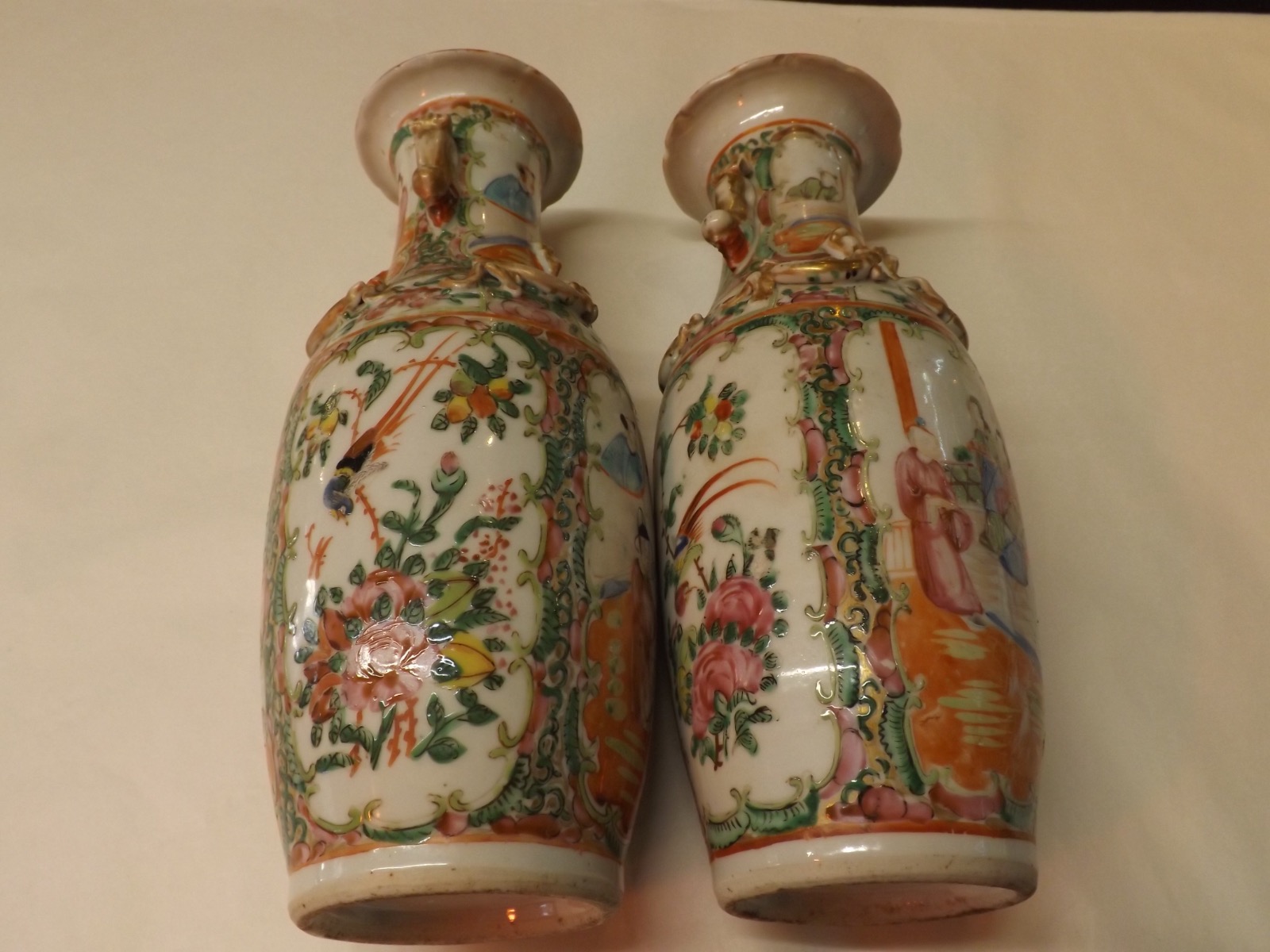 Pair of 19th Century Chinese / Cantonese vases with dogs of foe handles, approximately 26cm tall with a base diameter of 7cm. Beautifully hand painted with gilded edges and fluted top these are a lovely addition for any collection or a great starter piece.