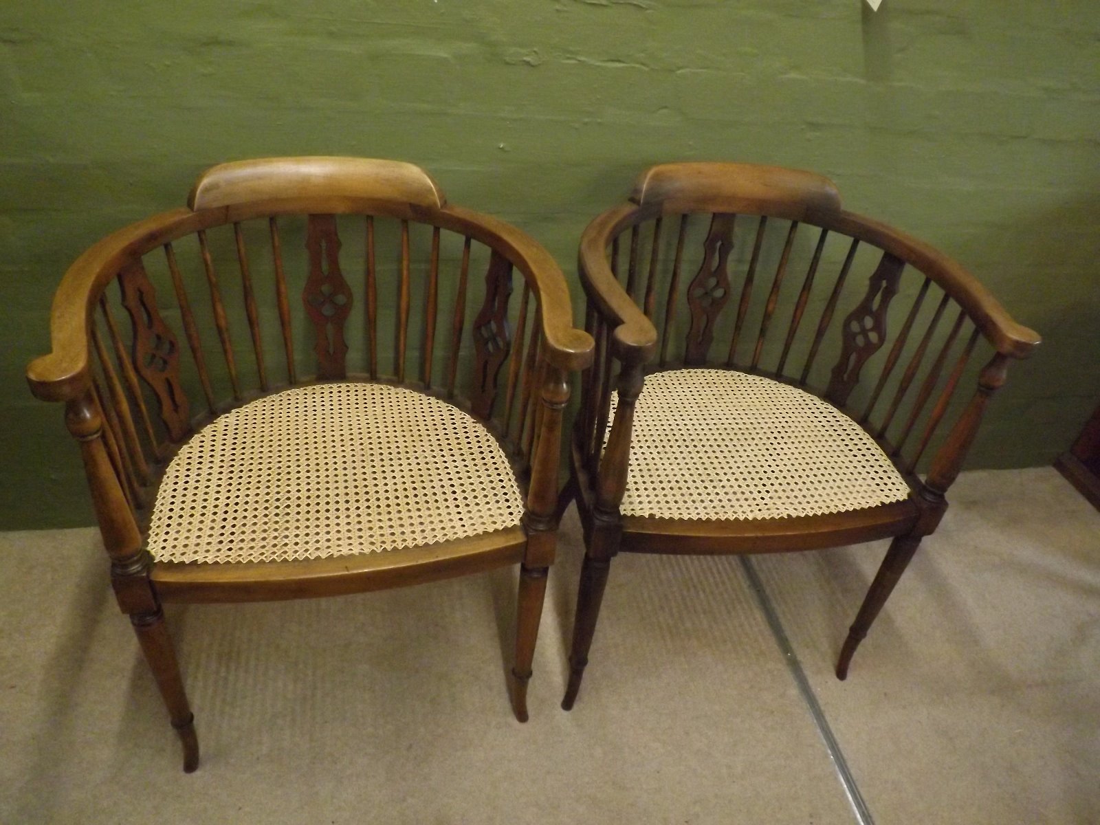 These are a pair of medium antique oak bow chairs with cane worked seats. The chairs display slight variations in colour due to sun.
