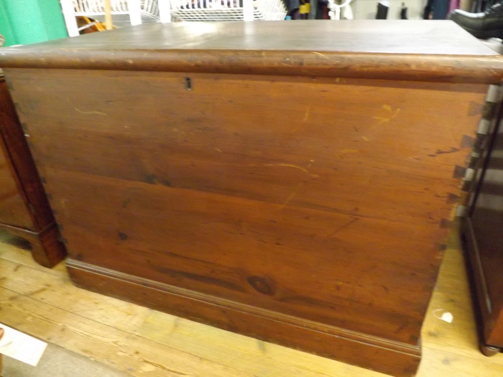 Unusually large Victorian antique pine blanket box with dove tail joints and metal handles. The lid has a snug fit and this item is in good condition.
