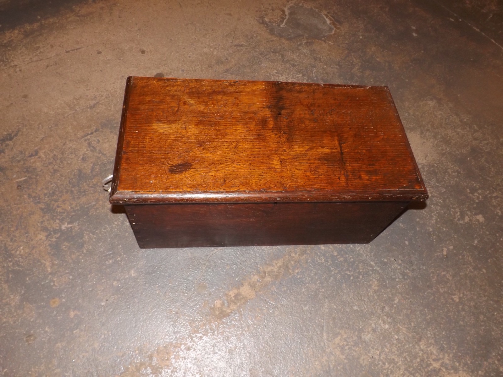 This is a small 19th Century antique pine grained blanket box with metal handles on either side.