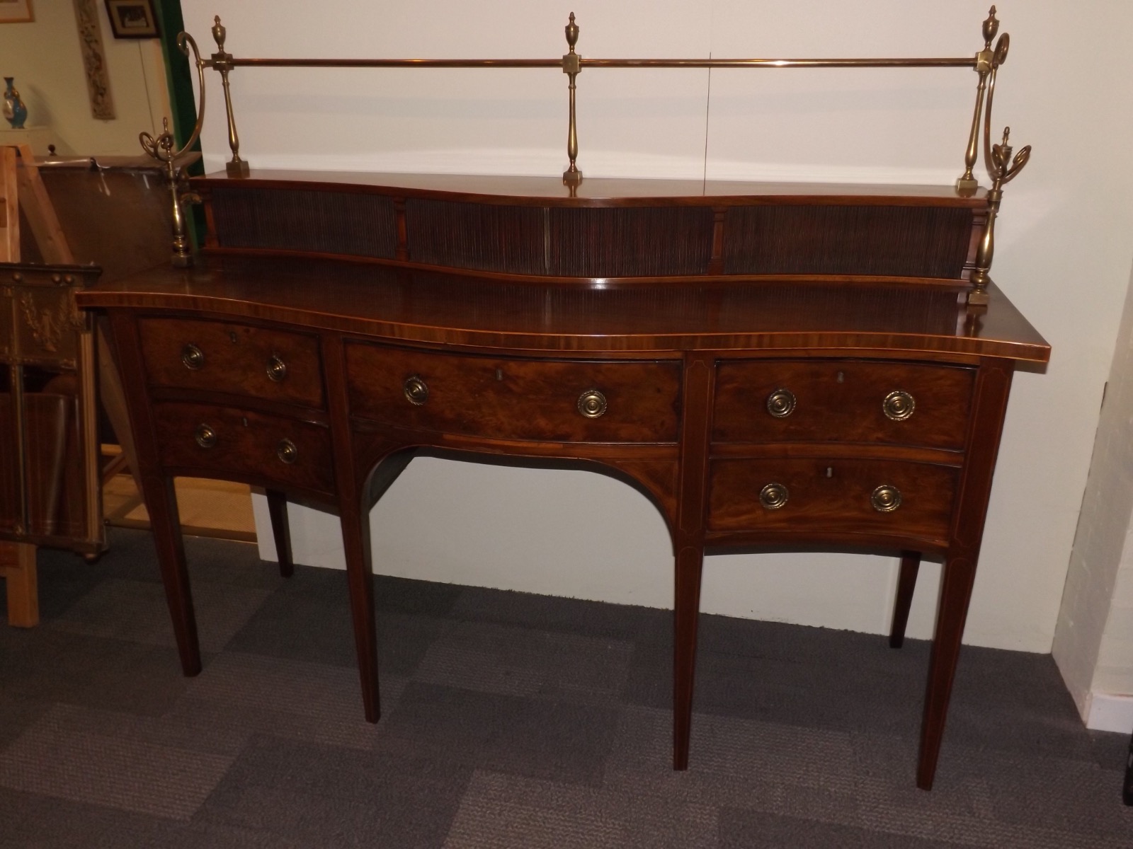 An outstanding regency mahogany serpentine fronted side board with ornate brass gallery by Muirhead and Moffatt of Glasgow. 70 Inches in length with tambour fronted gallery, ornate brass rail top central drawer flanked on one side by cellerette drawer and by double drawers on opposite side.