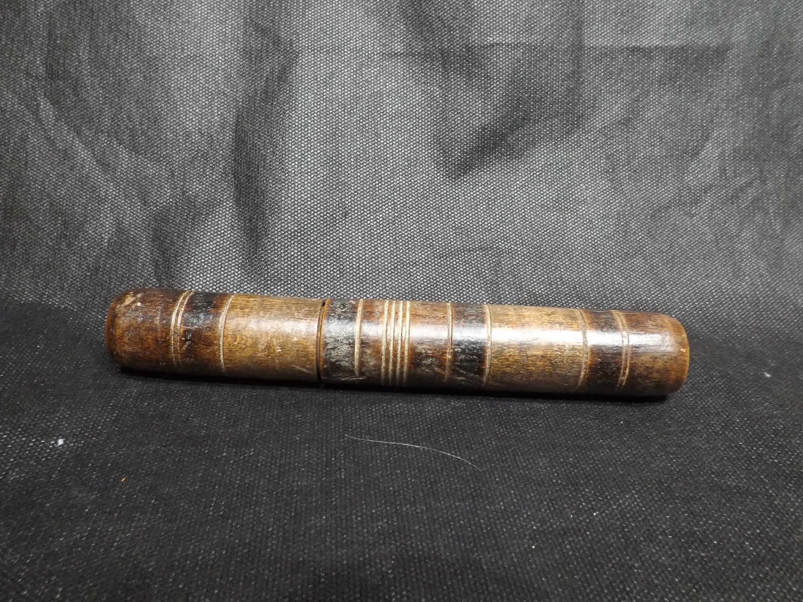 The case is a cylinder which slides apart to reveal the collection of needles needed to make and repair sails. The case measures 7.5inches long with a diameter of 1inch.