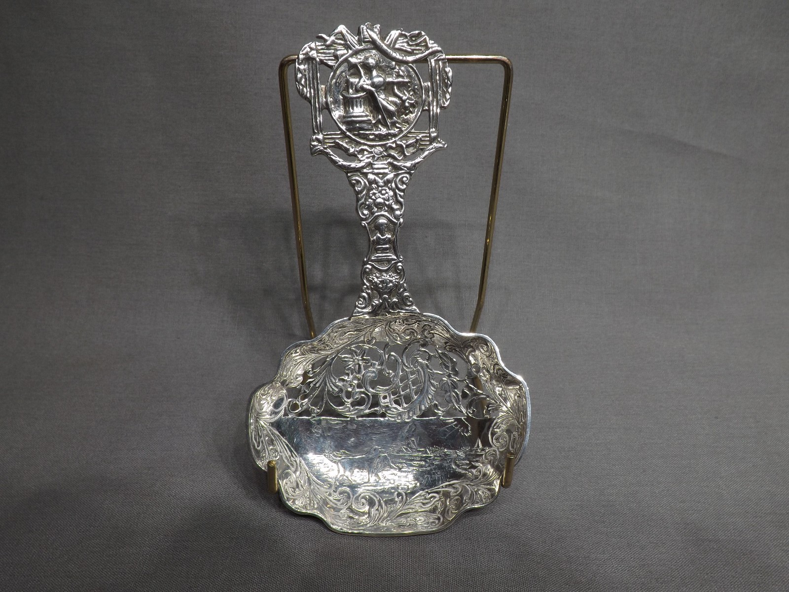 An elaborate hallmarked antique silver sifter spoon with windmill on handle and dog in landscape in bowl with piercing. Hallmarked 'Chester 1901'.