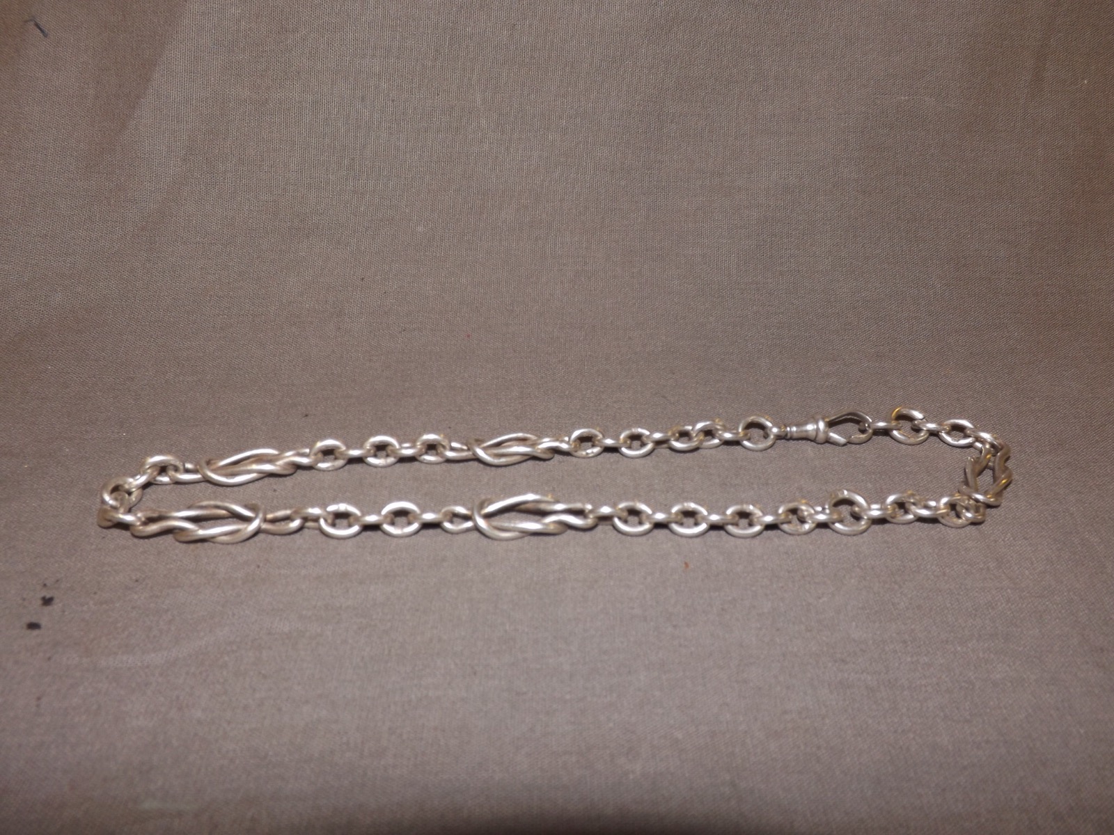 Hallmarked silver watch chain with usual links a combination of belcher with cross knots there is no date mark seen but looks to be late Victorian. Each link is stamped 925.