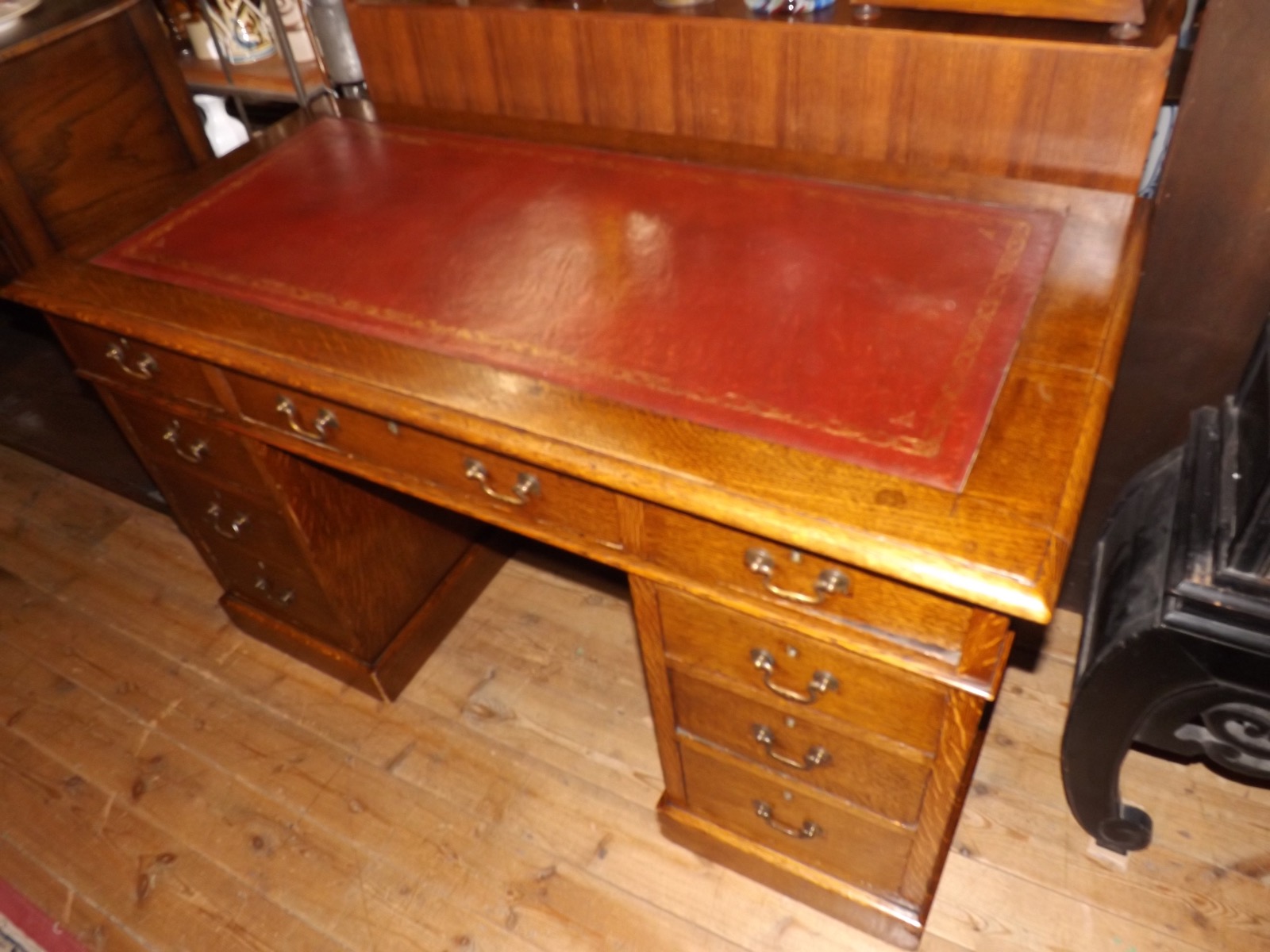 Beautiful small Victorian oak desk with red leather top with gilt detailing. This desk breaks down into three sections for transportation. The wood has a beautiful patina which works well with the red leather. There are nine drawers in total each with brass handles.