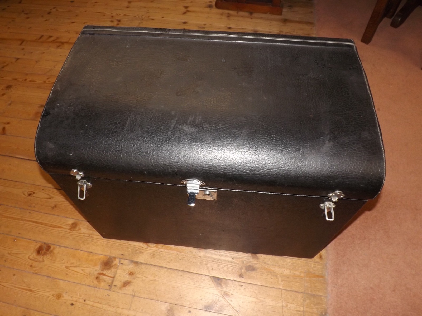 Patented black leather car trunk with english lever lock - no key though sadly. The trunk has a patent number 302020 and has chrome effect latches.