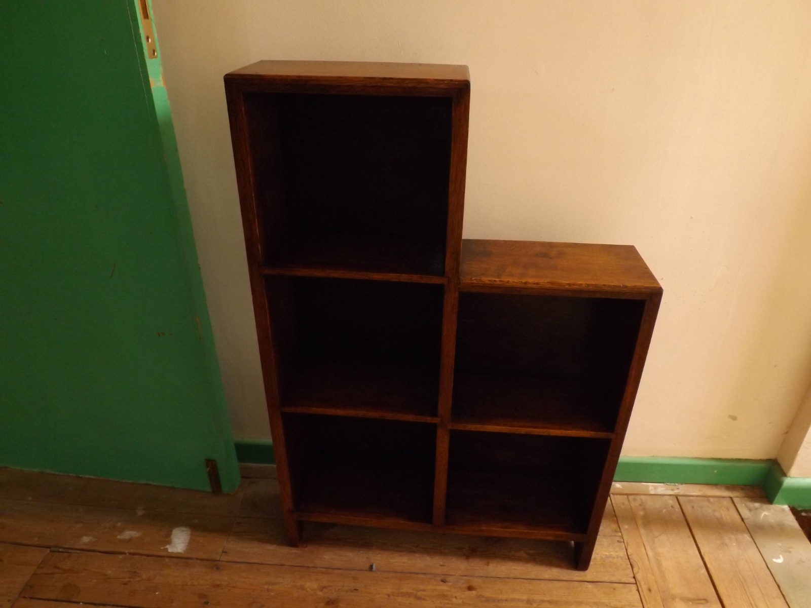 This is an unusual 1930s oak step bookshelves / pigeon holes storage unit.